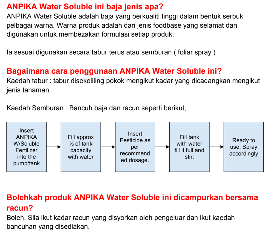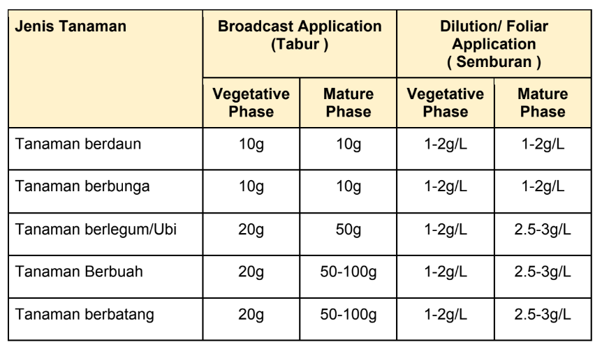 Baja gred larut tinggi yang terkenal dengan keterlarutannya dan dalam bentuk yang tersedia untuk tumbuhan untuk mengambil nutrien. 100% bahan import dengan dari bahan mentah berkualiti terbaik pengeluar di seluruh dunia diadun dan dicampur mengikut iklim tropika untuk prestasi terbaik.